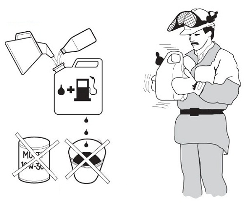 - Việc pha trộn xăng với nhớt (dầu) phải được thực hiện trong một bình sạch để chứa nhiên liệu.