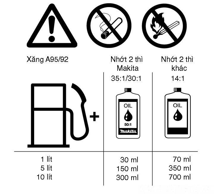 - Pha trộn (khuấy) kỹ hỗn hợp nhiên liệu trước khi đổ đầy bình nhiên liệu của thiết bị.