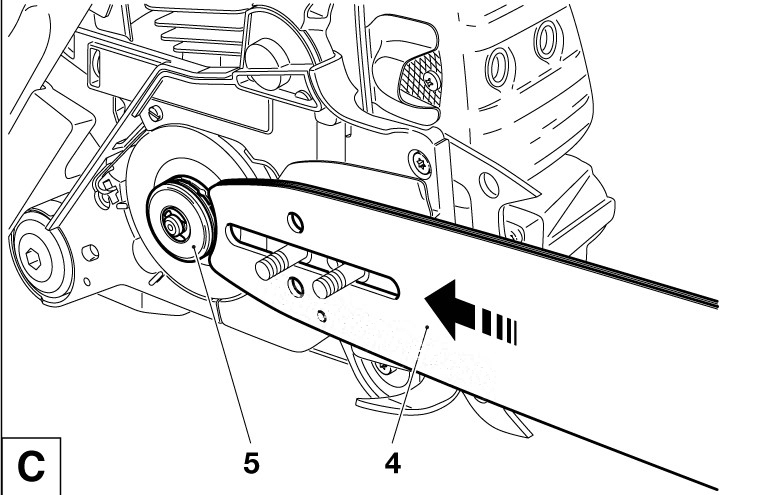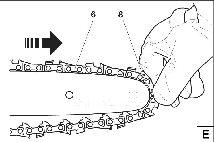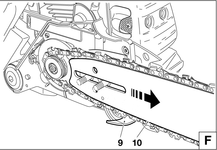 Đặt xích cưa lên trên tấm giữ xích (9). Kéo lưỡi cưa (hay còn gọi là lam) theo hướng mũi tên sao cho xích cưa bám chặt vào mép dưới của lam.