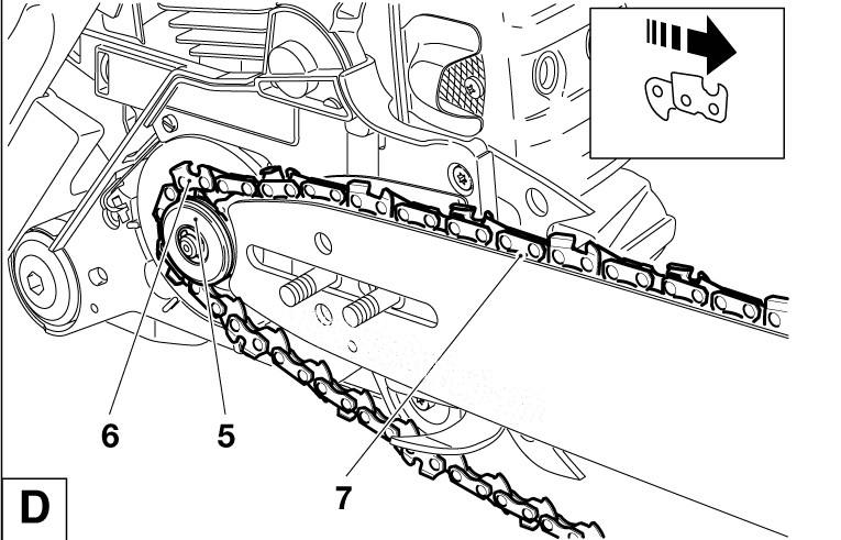 Lắp xích cưa (6) vào bánh răng (5) (hay còn gọi là nhông đồng tiền). Dùng tay phải đặt xích cưa vào khe dẫn xích phía trên (7) của lưỡi cưa (hay còn gọi là lam).