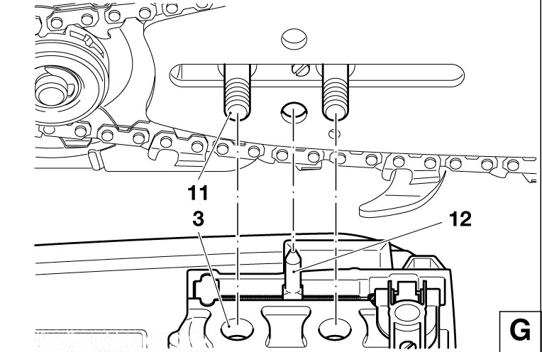 Cân chỉnh sao chổ lỗ định vị trên tấm chắn bảo vệ (nắp ốp lam) (3) khớp với bu-lông (11). Vặn chặt vít căng xích sao cho bu-lông căng xích cưa (12) khớp với lỗ định vị trên lưỡi cưa (lam). Lắp tấm chắn bảo vệ (nắp ốp lam). Xiết chặt đai ốc bắt tấm chắn bảo vệ (nắp ốp lam).