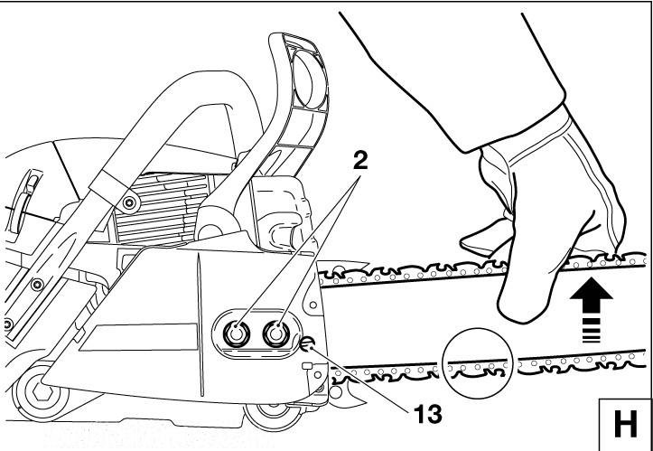 Căng xích cưa: Nâng nhẹ nhàng mũi lưỡi cưa (lam) và vặn vít căng xích cưa (13) theo chiều kim đồng hồ, cho đến khi xích cưa bám chặt vào mép dưới của lưỡi cưa (lam). Tiếp tục nâng lưỡi cưa (lam) và dùng khóa xiết chặt đai ốc (2).