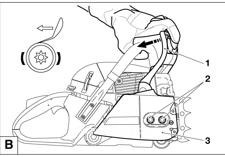 Nhả phanh xích, để tấm chắn bảo vệ tay (1) (hay còn gọi là tay thắng) di chuyển theo hướng mũi tên.